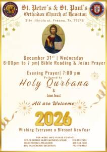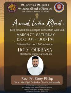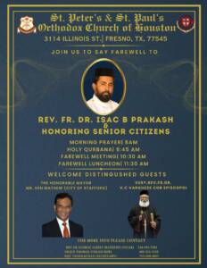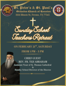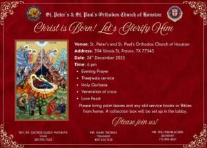 Events OCYM Blood Drive Holy Week MGOCSM Lenten Retreat Annual Lenten Retreat MMVS Bake sale Lenten Home Prayers Sunday School Teachers' Retreat Nineveh Fast Prayer & Divine Liturgy New Year service Christmas service Apostolic Visit Farewell of Rev. Fr. Dr. Isac B Prakash OVBS 2025